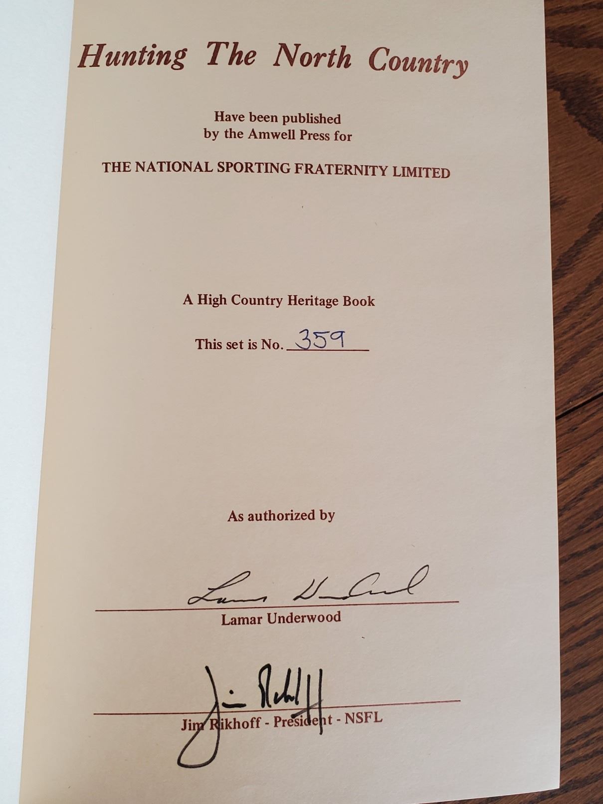 Description: A collection of 8 hard cover books(some slightly worn) from the collection of Bill and Ingrid Moynihan. This set's titles include: "Skills for Taming the Wilds"(paperback) by Bradford Angier, "Montana's Charlie Russell" by Jennifer Bottomly-O'Looney and Kirby Lambert, "The Gunner's Bible"(paperback) by Bill Riviere, "The New Hunter's Encyclopedia", "Alberta Wildlife Trophies" by Alberta Fish & Game Assoc., "Bowhunting Big Game Records of North America, 1st edition 1975", "Hunting The North Country-Volume 1 & 2" (#359 of 1000)signed by Lamar Underwood, "Real Cowboys, Grand Canyon to Mexico" signed by Ed Ashurst