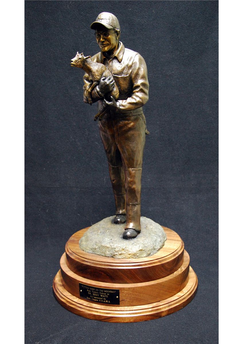 Donation: The bronze sculpture “Putting Sheep on the Mountain” is Rick Taylor’s personal tribute to his friend, the late Dr. Jerry Waite. It was donated and auctioned for the first time at the 2011 “Sheep Show” and purchased by Bernie and JoAnn Fiedeldey. By purchasing this item you are joining Bernie and JoAnn in truly trying to put more sheep on the mountain. Dr Waite wasn’t just a member and past president of FNAWS--Doc was FNAWS. He epitomized everything FNAWS stood for. He coined the phrase “Putting Sheep on the Mountain” and gave everything of himself to make National and the Iowa Chapter successful, even if it meant doing the work from a wheelchair. Doc was your “down to earth” charter member of the organization who knew that a buck earned here and a buck earned there made dollars for the wild sheep. Dr Waite was the recipient of the “Presidential Award” in 2000. As he wheeled his wheelchair toward the podium, we looked at a man who had given his heart and soul to the organization he loved. The money raised by the auction of the annual sponsorship of this project will be split between a pet project of the “Biologist of the Year” and other “on the ground” projects. The sponsor(s) will be featured on the sculpture which will be on public display at the WSF headquarters in Cody, Wyoming. It will also be on display at the annual convention. Rick Taylor made a second sculpture entitled “Free at Last” depicting the lamb as it is being released and is jumping for joy. Each annual sponsor will take one of these home with a personalized engraved tag.