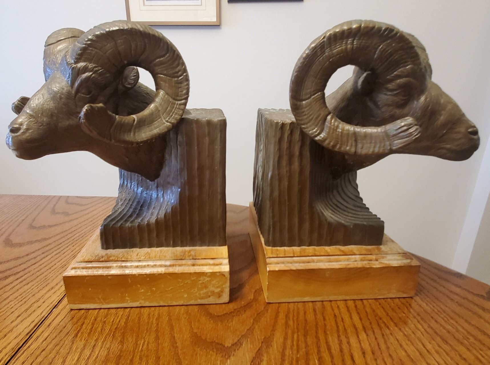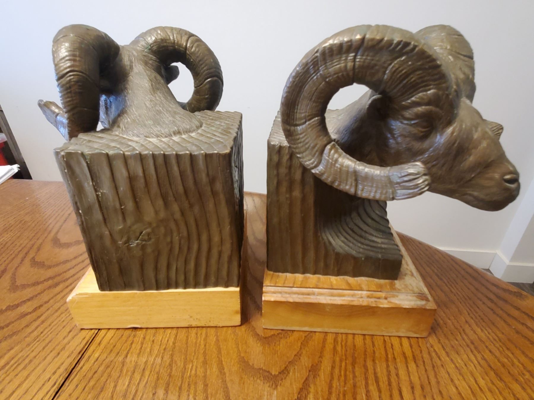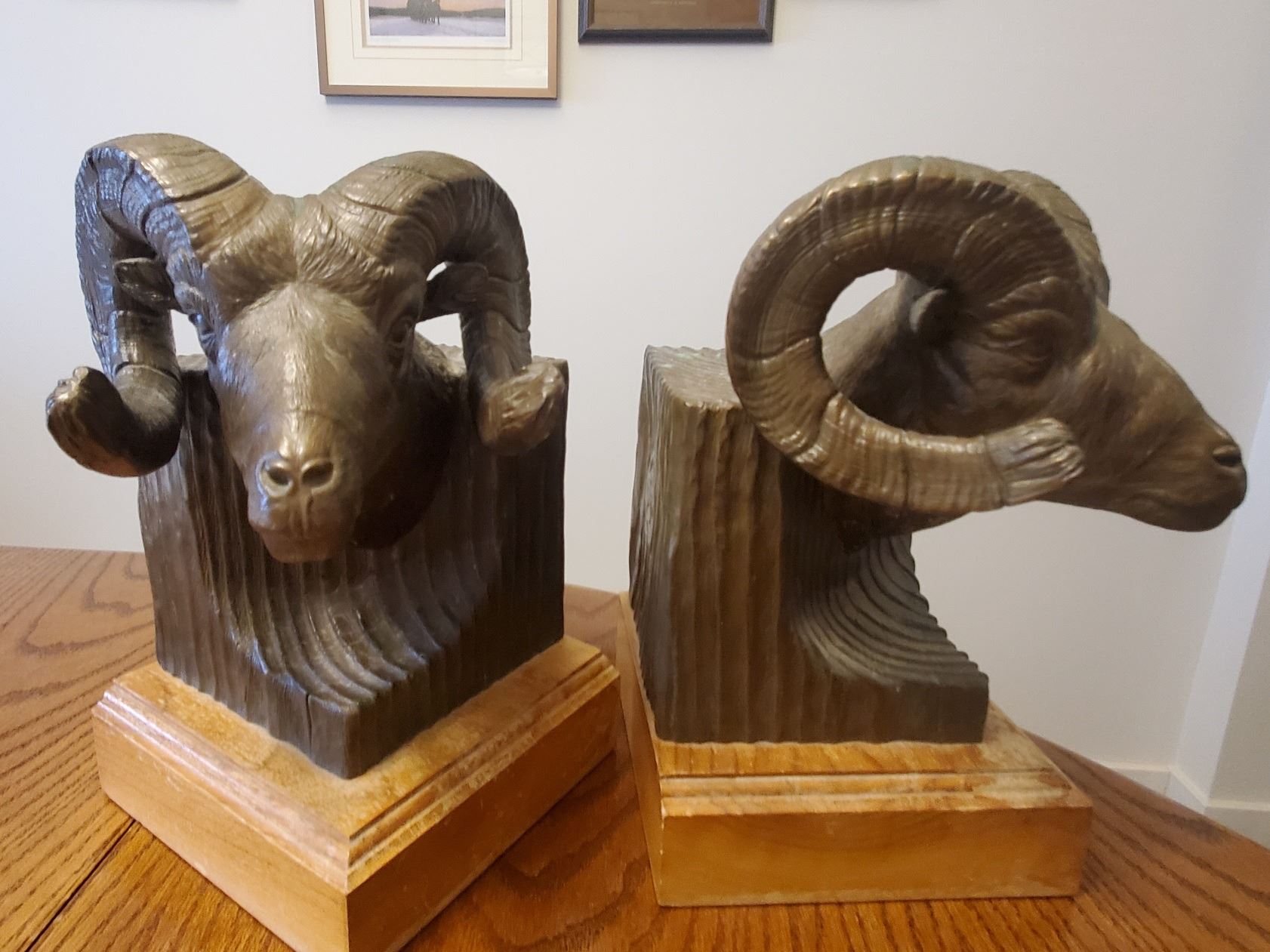 Description: These bronze sheep head bookends were created by Bill Davis in 1982 They measure approximately 6" x 9" and are #10 of 12. From the collection of Bill and Ingrid Moynihan.