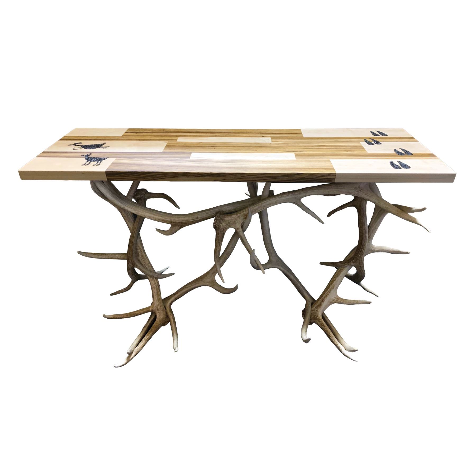 DONATION: Elk antler sofa table custom built by WSF Treasurer Charlie Kelly includes maple and zebra wood plank top w/black glass inlayed sheep petroglyph and sheep tracks. The elk antlers provided for this table have been donated by Arlene Hanson and her late husband Robert. They provided them to Charlie knowing he makes furniture for Conservation Organizations like WSF. A big “Thank You” to Arlene and Charlie for this beautiful piece.