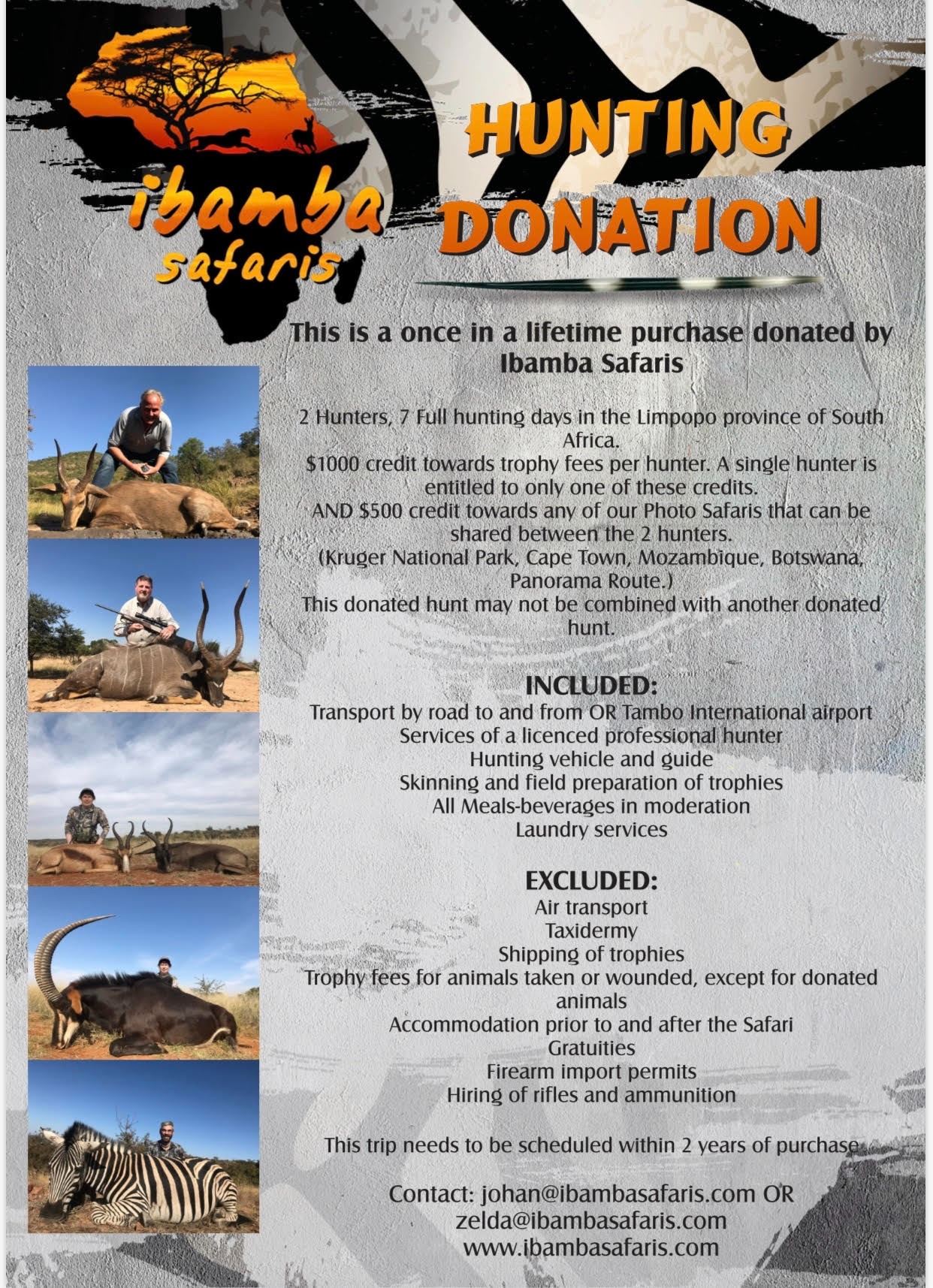 DONATION: 7-day hunt for 2 hunters in Limpopo, South Africa. Purchasers will each receive a $1,000 credit towards a trophy fee AND $500 credit towards any of our Photo Safaris that can be shared between 2 hunters. (Kruger National Park, Cape Town, Mozambique, Botswana, Panorama Route. This hunt may not be combined with another donated hunt.