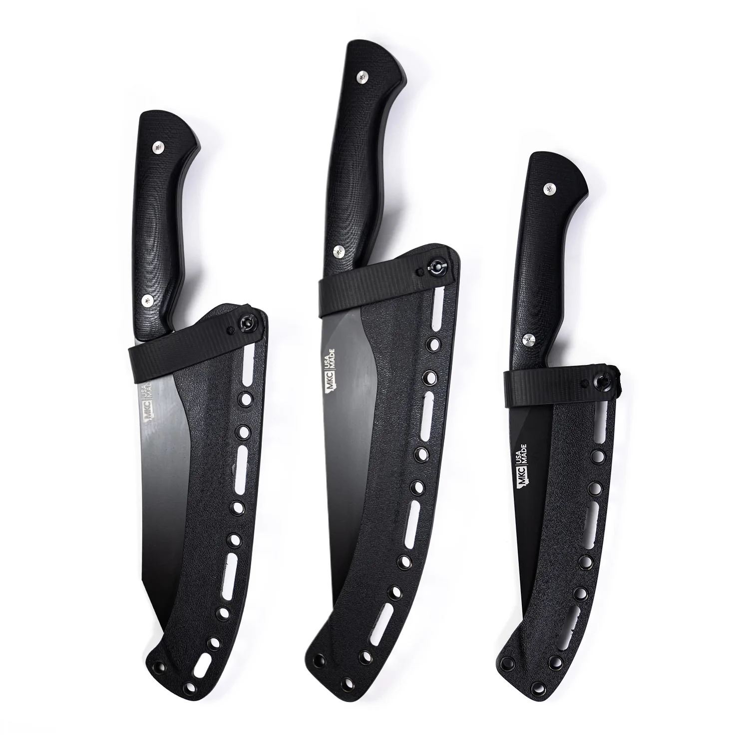 DONATION: The MKC Culinary Collection features all three knives from the collaboration between MKC Founder & Master Bladesmith, Josh Smith and renowned knife maker Mareko Maumasi — with his extensive knowledge as a bladesmith and experience in the restaurant industry. The knives are made with Magnacut Stainless Steel and finished with a black Cerakote® coating for optimal durability. The handles are constructed of G-10 and contoured for a comfortable grip. The MKC Culinary Collection is the perfect set of tools for any chef looking to up their game. Whether you're a beginner or a seasoned pro, this collection has everything you need to tackle even the biggest jobs from the kitchen to the campsite.