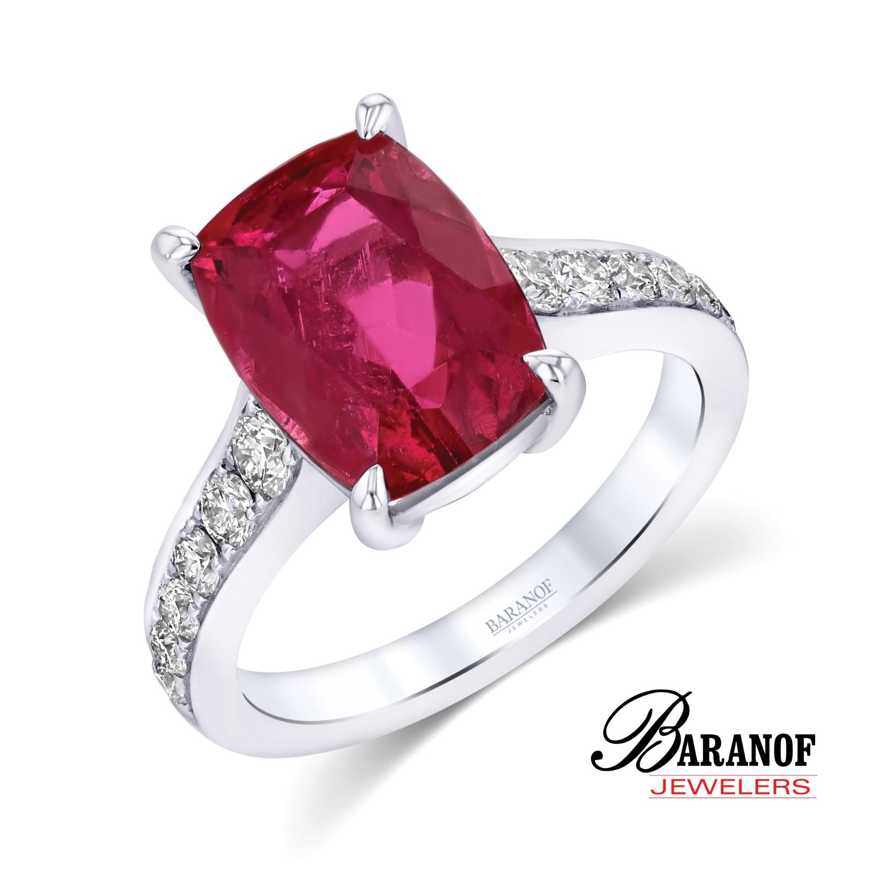 DONATION: This 4.90 carat rare Rubellite tourmaline and diamond ring is set in 18 karat white gold with 0.75 carat of natural white diamonds. Diamonds are f in color, vs1 clarity. Diamonds are E color, Vs1 clarity.