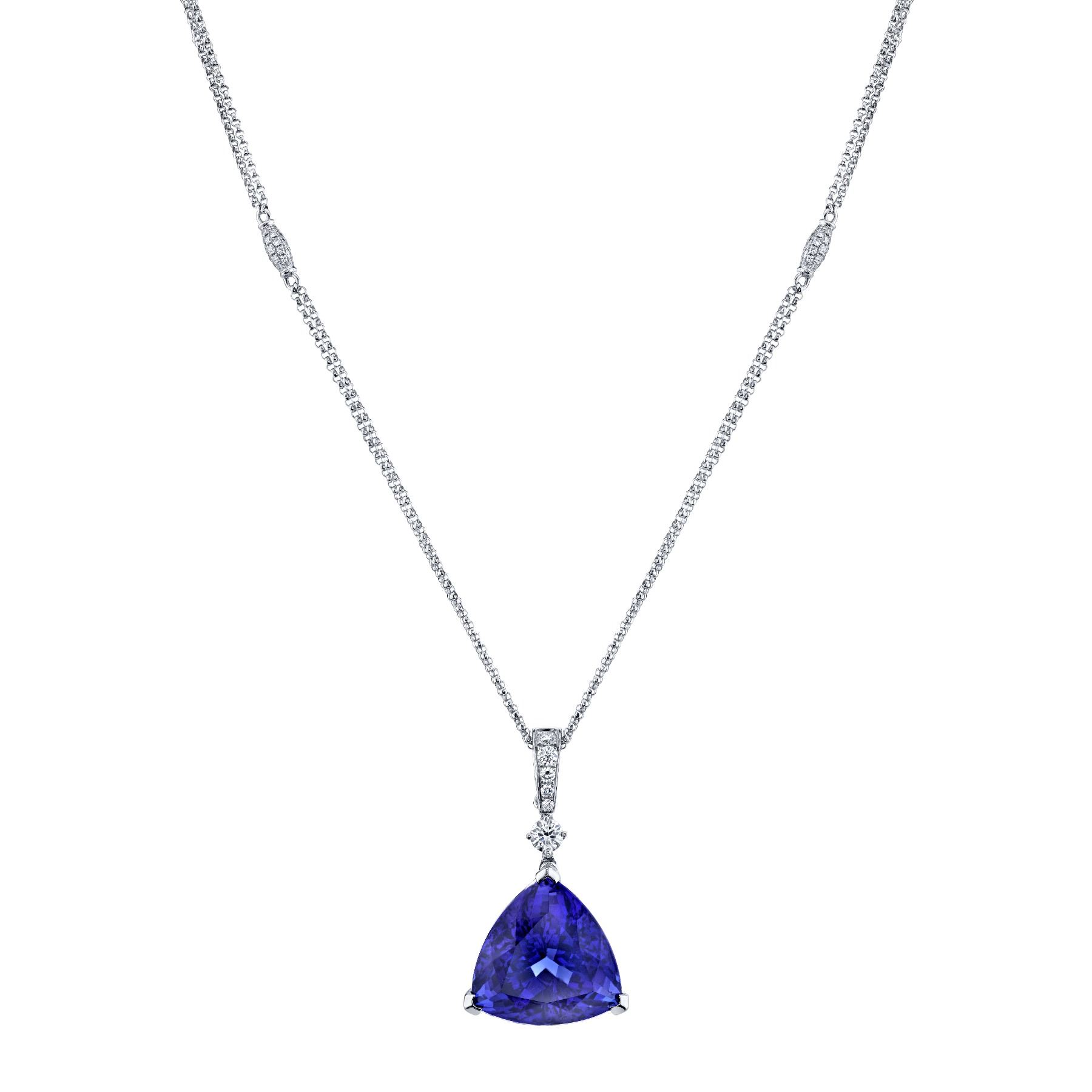 DONATION: Natural Trillion Tanzanite necklace set in 18 karat white gold, color is violet blue vivid with a carat weight of 15.00 carats. Diamonds are F in color and Vs1 in clarity with a carat weight of 1.00cts.