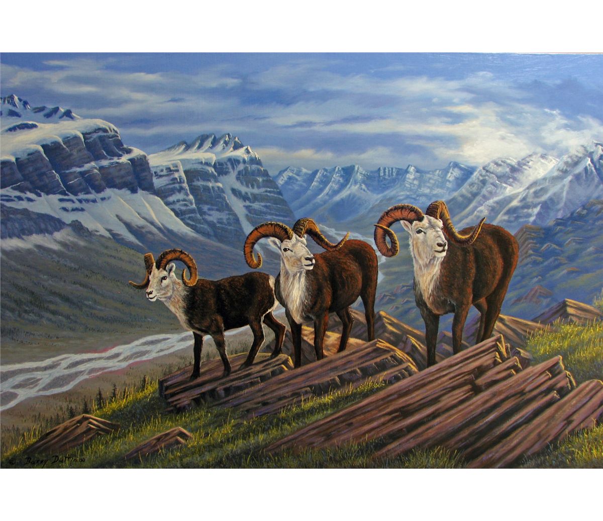 Donation: Enjoy this original painting on canvas by Barry Dumaw. “McDonald River Stone’s” showing Stone’s sheep in Northern British Columbia in the McDonald River area.